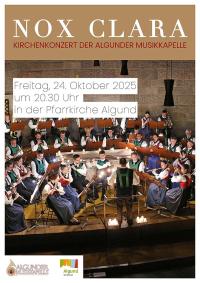 Nach drei Jahren „Zwangspause“ ist es wieder so weit: Am Freitag, dem 28. Oktober um 20.30 Uhr lädt die Algunder Musikkapelle mit ihrem Kirchenkonzert „Nox clara“ wieder alle Blasmusikfreunde aus nah und fern ein, in der Pfarrkirche zum Hl. Josef in Algund eine Stunde besinnlicher Blasmusik zu lauschen. |