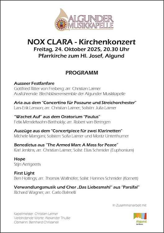 Bevor für die Algunder Musikkapelle die intensive Probenphase für das traditionelle Dreikönigskonzert beginnt, steht für die Musikerinnen und Musiker noch ein besonderer Herbsthöhepunkt auf dem Programm: das Kirchenkonzert „Nox clara“ in der Pfarrkirche zum Hl. Josef in Algund. Am Freitag, 24. Oktober 2025, um 20.30 Uhr lädt die Kapelle alle Freunde der Blasmusik zu einem stimmungsvollen Konzertabend ein. In der abgedunkelten Kirche entsteht eine besondere Atmosphäre, die Raum für Besinnung und musikalischen Genuss bietet. Das Programm verspricht eine abwechslungsreiche musikalische Reise mit Werken von Gottfried Ritter von Freiberg, Lars-Erik Larsson, Felix Mendelssohn-Bartholdy, Michele Mangani, Karl Jenkins, Stijn Aertgeerts, Ben Hollings und Richard Wagner. Neben der gesamten Musikkapelle werden auch kleinere Ensembles und Solistinnen und Solisten zu hören sein: das Blechbläserensemble sowie Julia Laimer (Posaune), Sofia Laimer und Moritz Unterthurner (Klarinetten), Elias Schmider (Euphonium) und Hannes Schmider (Kornett). Die musikalische Leitung liegt in den Händen von Kapellmeister Christian Laimer, durch das Programm führt Alexander Thuille. Der Eintritt ist frei. „Nox clara“ bietet damit nicht nur ein besonderes Hörerlebnis, sondern auch einen Moment der Ruhe und Besinnung inmitten des Herbstes – ein Abend, den Blasmusikfreunde nicht verpassen sollten. |